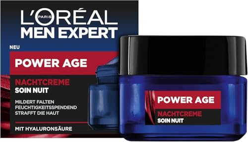 L'Oréal Män Expert nattkräm mot rynkor för män, anti-aging fuktkräm för ansiktet mot trött och matt hud, ansiktskräm för män med hyaluronsyra, Power Age, 1 x 50 ml