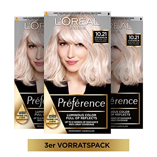 L'Oréal Paris permanent hårfärg, hårfärgningsset med färg och färgglans vård balsam, préférence, 10,21 platina pärlemorblond, set om 3