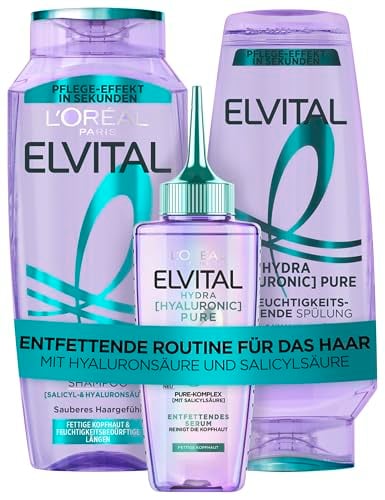 L'Oréal Paris Elvital Hydra [Hyaluronic] Pure Set: schampo 300 ml, balsam 250 ml & serum 102 ml, för glänsande hår och långvarig friskhet