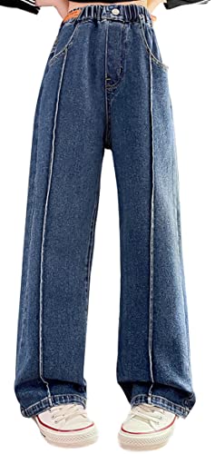 Jeans för flickor breda ben säckiga byxor slitna rippade jeans vardagliga lösa raka byxor elastisk midja denimbyxor, Blå -3, 14-15 År