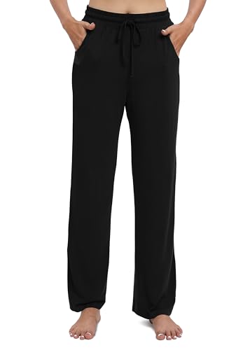 Kvinnors långa modal bekväma dragsko byxor lösa raka ben för yoga löpning, Svart, M