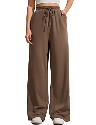 FACDIBY Träningsbyxor med vida ben för kvinnor, med hög midja, elastiska lösa byxor med dragsko, med fickor, Brun, XXL
