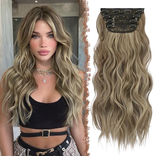 FESHFEN Clip i Hårförlängningar 4PCS Långa Vågig Hårförlängning Klips in Förlängningar Syntetiska Löshår Mörk askblond Blandad blekblond Hårstycke för Kvinnor, 50 cm