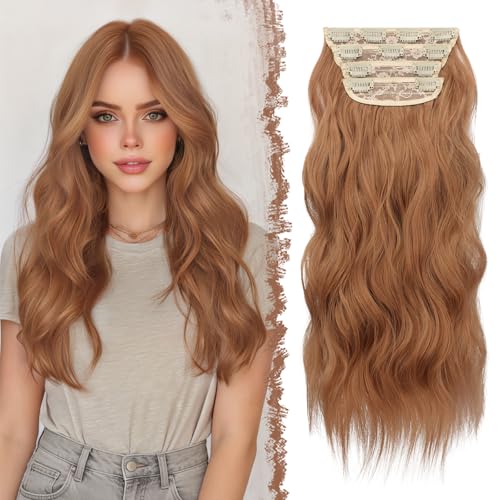FESHFEN Clip i Hårförlängningar 4PCS Långa Vågig Hårförlängning Klips in Förlängningar Syntetiska Löshår Karamellbrun blandad askblond Hårstycke för Kvinnor, 50 cm
