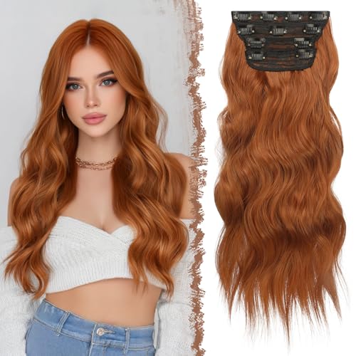 FESHFEN Clip i Hårförlängningar 4PCS Långa Vågig Hårförlängning Klips in Förlängningar Syntetiska Löshår Kopparröd Hårstycke för Kvinnor, 50 cm