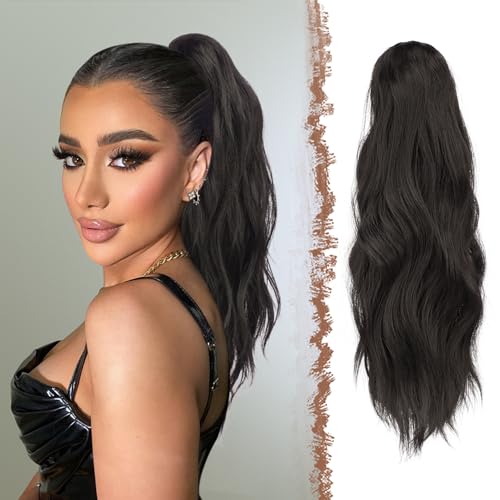 FESHFEN Långt Vågigt Hästsvans Hårförlängning med Kloklämma 65 cm Lockigt Hästsvansförlängnings Klämma i Syntetiskt Hårstycke Löshår Ponytail Extension för Kvinnor, Svart brun