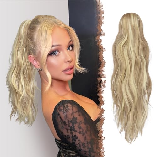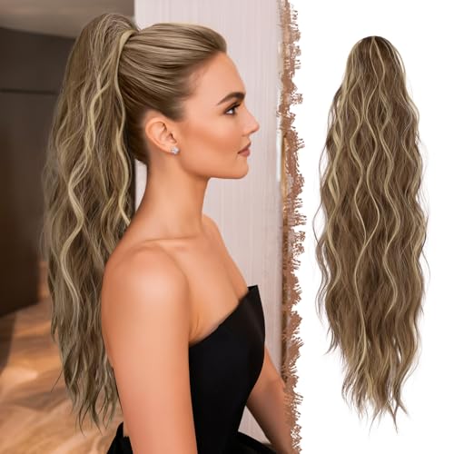 FESHFEN Vågiga Hästsvans Förlängning med Klämma - Vågigt Lång Hårförlängning Claw Clip Ponytail Extension Syntetisk Hårstycke Löshår för Kvinnor, 63 cm Ljusbrun & Blond