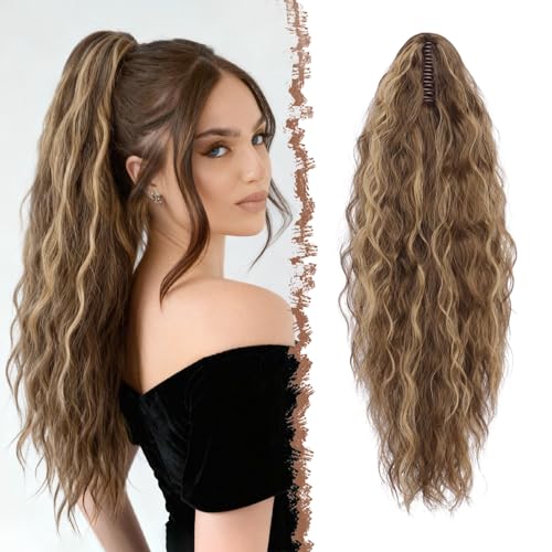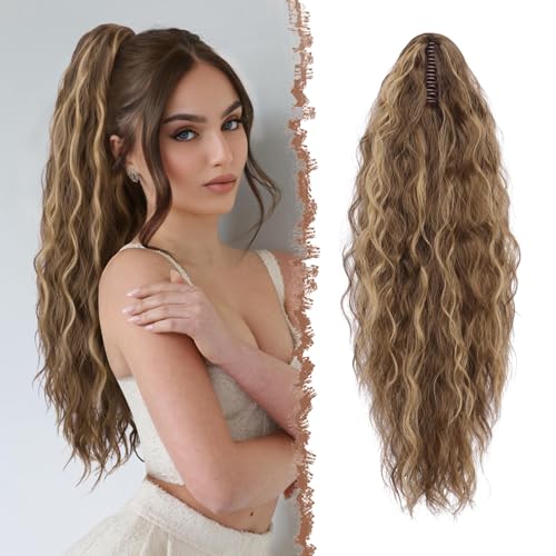 FESHFEN Vågiga Hästsvans Förlängning med Klämma, 50 cm Vågigt Lång Fluffig Hästsvans Hårförlängning Claw Clip Ponytail Extension Syntetisk Hårstycke Löshår för Kvinnor, Brunett Blandat Blond
