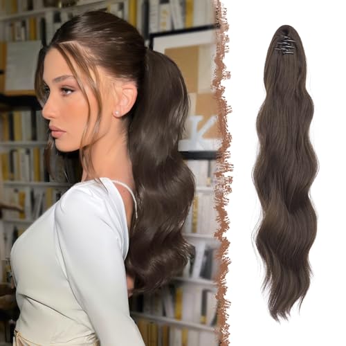 FESHFEN Vågiga Klämma Hästsvans Förlängning, Lång Lockigt Hästsvans Hårförlängning Claw Clip Ponytail Extension Syntetiska Hårstycke Chokladbrun Löshår för Kvinnor, 50 cm