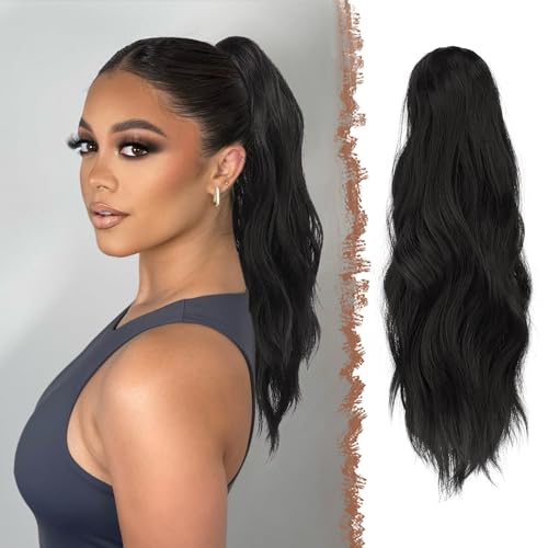 FESHFEN Vågiga Hästsvans Förlängning med Klämma, 50 cm Vågigt Lång Fluffig Hästsvans Hårförlängning Claw Clip Ponytail Extension Syntetisk Hårstycke Löshår för Kvinnor Natur Svart