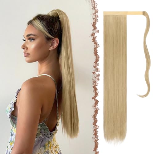 FESHFEN Lång Rakt Hästsvansförlängning - Klipp i Hästsvans Förlängning Ponytail Extension Syntetisk Raka Löshår för Kvinnor, 60 cm Pale Golden Blonde & Bleach Blonde