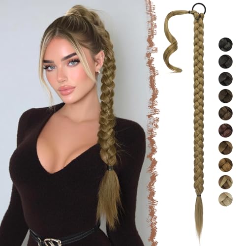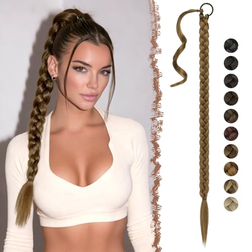 FESHFEN Lång Flätad Hästsvans Förlängning med Hårsnodd Long Braid Ponytail Extension Hår Hästsvans Förlängningar Ljusbrun Syntetiskt Hårstycke Löshår för Kvinnor, 65 cm