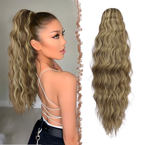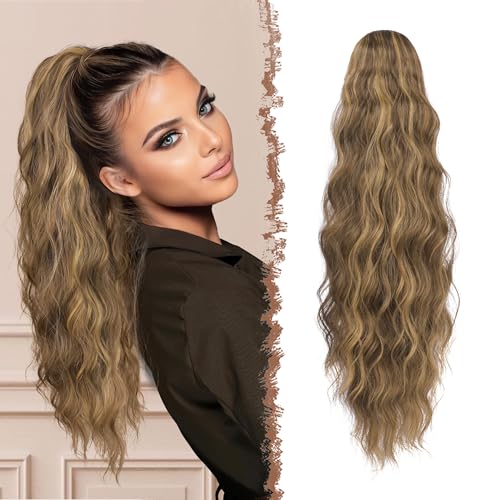 FESHFEN Lång Vågigt Hästsvans Hårförlängningar, Lockig Hästsvansförlängningar Hår Ponytail Extension med kärl Syntetiska Löshår Hårstycke Förlängning för Kvinnor, 60 cm Ljusbrun & Blond