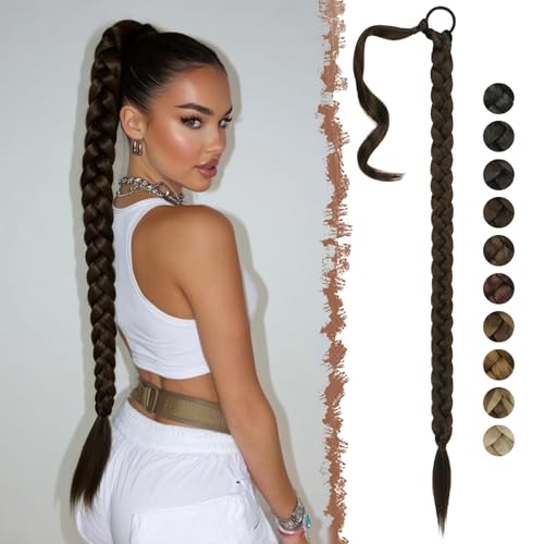 FESHFEN Lång Flätad Hästsvans Förlängning med Hårsnodd 65 cm Long Braid Ponytail Extension Kastanjebrunt Hår Hästsvans Förlängningar Syntetiskt Hårstycke Löshår för Kvinnor