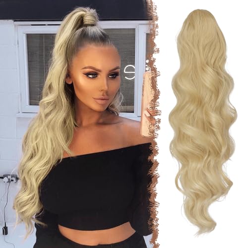 FESHFEN Lång Vågigt Hästsvans Hårförlängning med Dragsko 65 cm Lockig Ponytail Extension Clip in Syntetiska Löshår Hårstycke Förlängning för Kvinnor, Platinablond