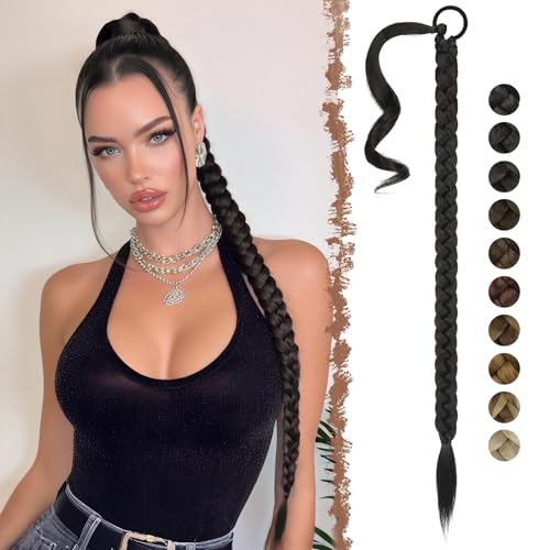 FESHFEN Lång Flätad Hästsvans Förlängning med Hårsnodd 85 cm Long Braid Ponytail Extension Hår Hästsvans Naturlig Svart Förlängningar Syntetiskt Hårstycke Löshår för Kvinnor