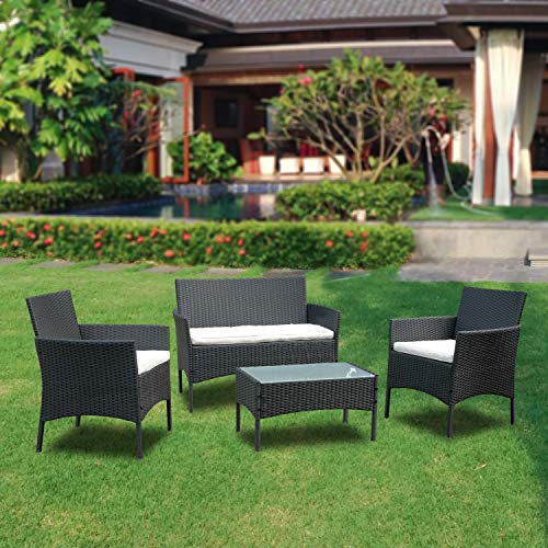 Fiqops Poly Rotting trädgårdsmöbelset, balkongmöbler, väderbeständig, med 2 soffor, enkelstolar, bord och sittkuddar, sittgrupp lounge för terrass balkong trädgård, svart