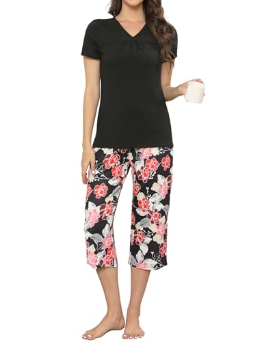 TeJoyce kort dampyjamas sommar bomull, tvådelad pyjamas med 3/4 byxor kvinnor, set kortärmade toppar och blomtryck capri-underdel, bekväm och mjuk loungewear S–XXL, svart, L