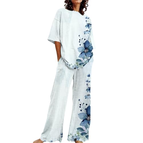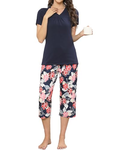TeJoyce kort dampyjamas sommar bomull, tvådelad pyjamas med 3/4 byxor kvinnor, set kortärmade toppar och blomtryck capri-underdel, bekväm och mjuk loungewear S–XXL, blå, XL