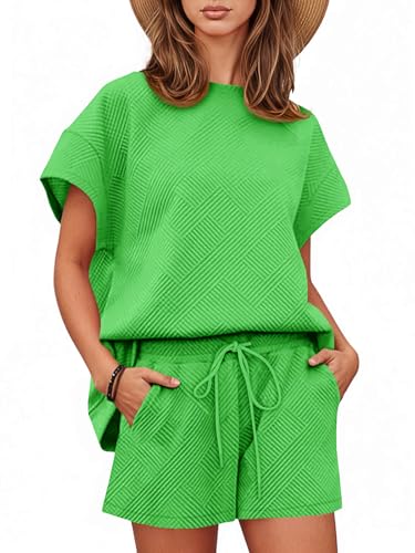 Tankaneo Loungewear för dam, kortärmad överdel och shorts, 2-delat set, matchande pyjamasset med fickor, Olive Drab, L