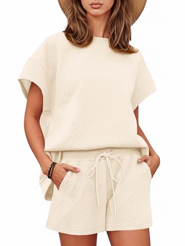 Tankaneo Loungewear för dam, kortärmad överdel och shorts, 2-delat set, matchande pyjamasset med fickor, BEIgE, XL