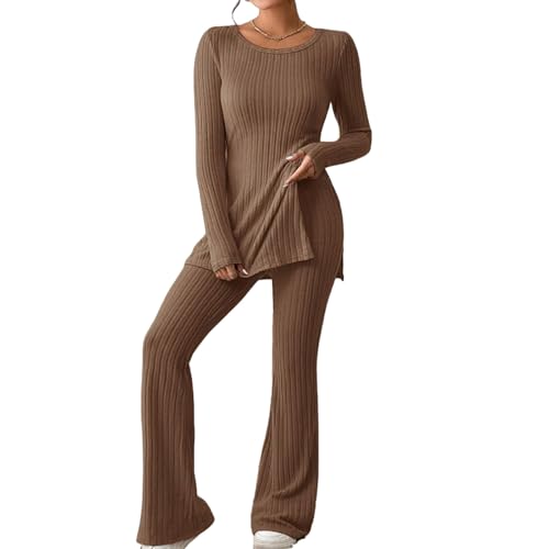 Ribbed Lounge Wear Sets for Women 2 Delar Co Ord Sets Träningsoverall Full Set Dam Pjs Set Loungewear Sovkläder Hemkläder Flare Byxor Långärmad Toppset Casual Outfits Pyjamas(Brown,XXL)
