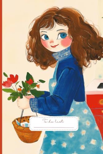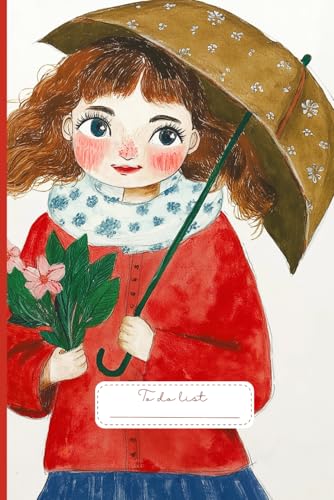 Cheerful Rainy Day To Do List: A charming cover featuring a lovely girl in a cozy red coat, holding fresh flowers while embracing the gentle rain under a beautifully patterned umbrella.