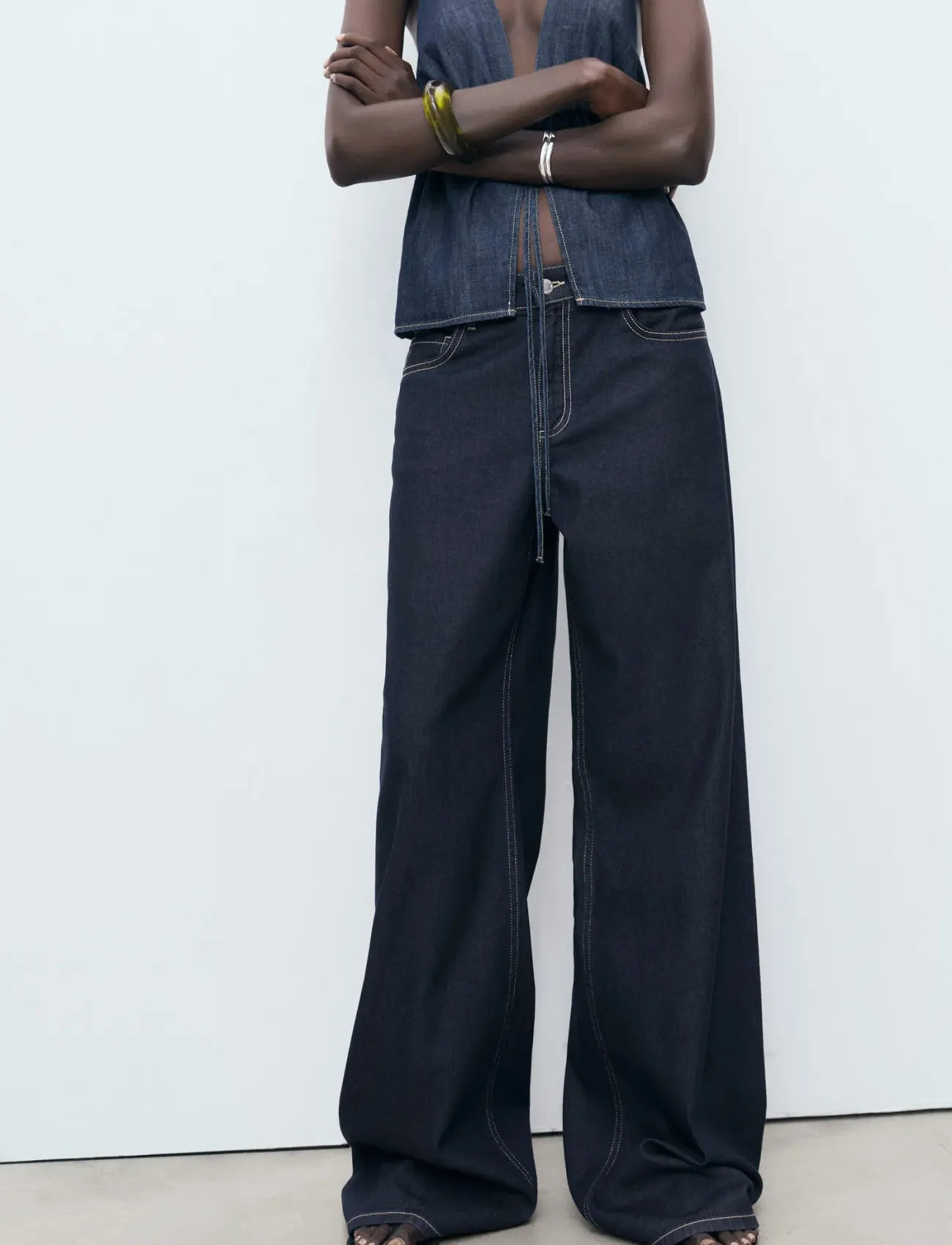 Mango Low Waist Wide Leg Jeans - Navy - 42