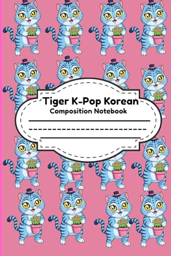 Tiger K-Pop Korean Composition Notebook: 120 Pages – Wide Ruled with Center Dotted Line – Blue Neon Tiger & Lucky Cat Notebook – 6 x 9 inches