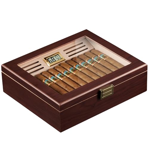 ProCase Trä cigarrhumidor med digital hygrometer och luftfuktare, naturlig cederinredning och klart glaslock, storlek M för 20–25 ren, klassisk present till män- M