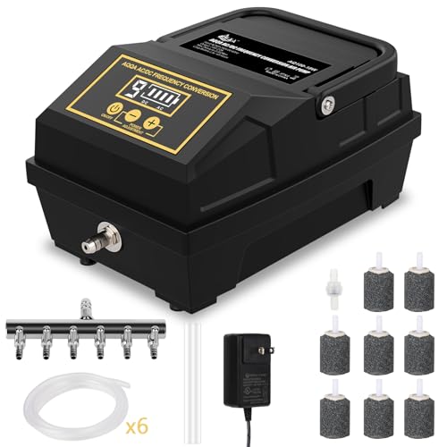 AQQA Akvarium luftpump, utomhus kraftfull damm syrepump, batteridriven 6 uttag akvarium luftare, 10 W justerbar akvarium syrepump, med tillbehör, upp till 2200 L