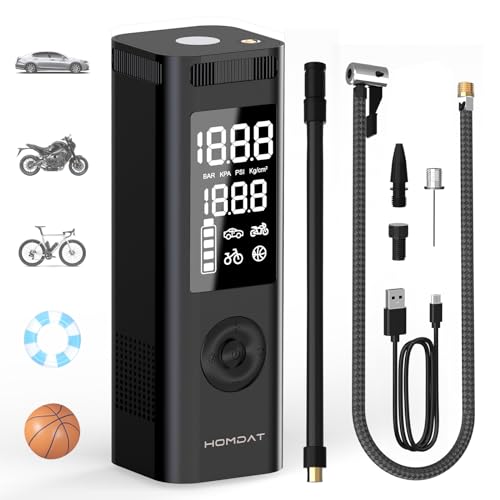 homdat Elektrisk luftpump med 7 800 mAh batteri, bärbar 150PSI/10,3bar cykelpump med LCD-skärm, kompakt 12 V luftkompressor för bildäck, cyklar, motorcyklar, basketboll, svart
