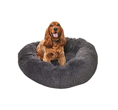 Sleepdown Shaggy rund plysch hund katt lugnande supermjuk munksäng, halkfri botten, maskintvättbar – medium (60 cm x 60 cm x 20 cm) – kolgrå