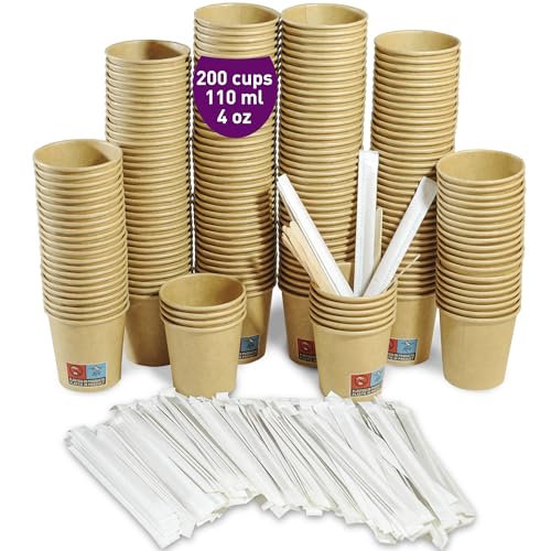 200 Pappersmuggar För Kaffe I Kraftkartong 110 ml / 4 oz. Mångsidiga Och Robusta Muggar För Espresso, Lungo, Macchiato Och Mer, Med Hygieniska Träpinnar Snyggt Inslagna I Papper.