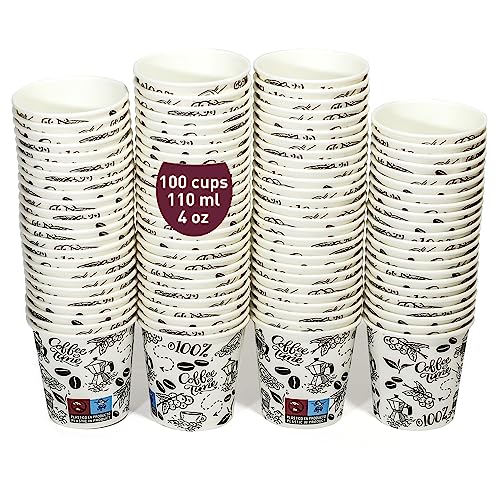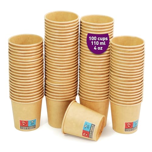 100 engångsmuggar av kraftpapper 110 ml / 4 oz för espresso och lungo. För kalla och varma drycker. Engångspappersmuggar