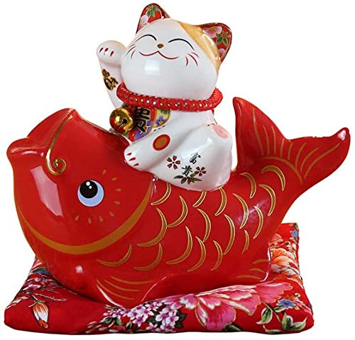 HTian Feng Shui keramisk lyckokatt sparbössa spargris maneki Neko förmögenhet katt och fisk hantverk ornament födelsedagspresent