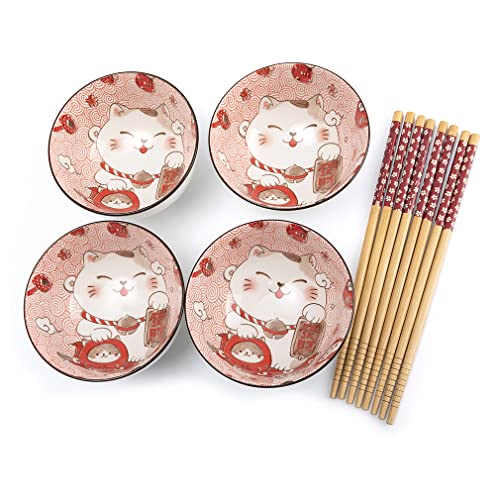 lachineuse - Maneki Neko 4 skålar set - risskålar, frukost och soppa - japansk porslinsservis - med pinnar - lyckokatt - japansk Kawaii Japan gåva - vit och röd