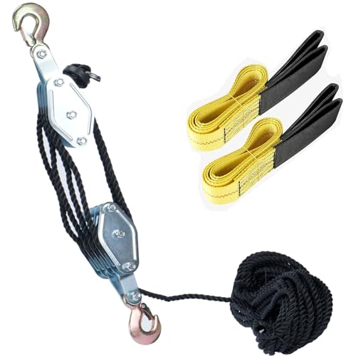 1,8 ton rephiss remskiva block med 2 st sadelband lyftband, 1 815 kg maximal belastning, kraftiga stålkrokar lyftremskivblock, 20 m (65,6 fot) nylonrep (svart+2 slingrem)