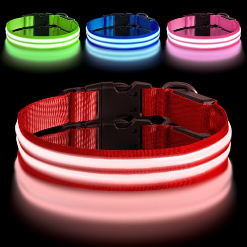 AUAUY Lysande uppladdningsbart hundhalsband, LED dubbelt ringhandtag, vattentätt, lätt för små/medelstora/stora hundar (röd-L)