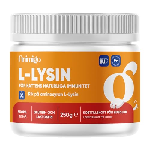 Animigo L-lysin för katter - 250g pulver - Ren aminosyra L-lysin för dina katters förkylningar, immunförsvar, försvar och välbefinnande - Naturliga ingredienser & vitaminer för katter