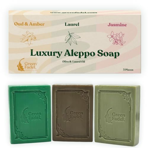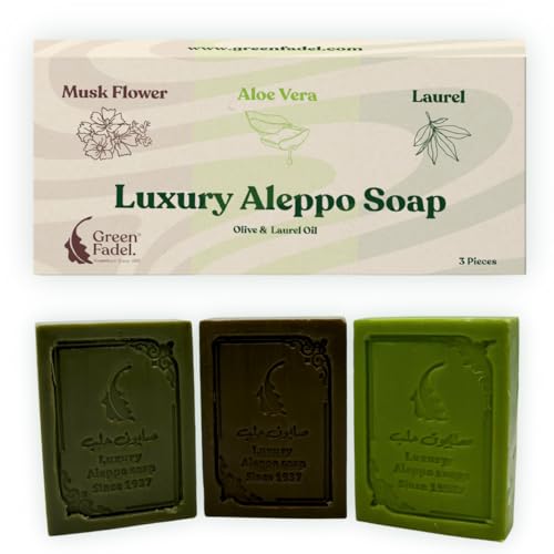 GREEN FADEL (Luxury) Original Aleppo tvål, uppsättning med 3: lagerblad, Aloe Vera, mysk, med olivolja och lagerolja, olivolja tvål, lyxig Aleppo soap, naturlig