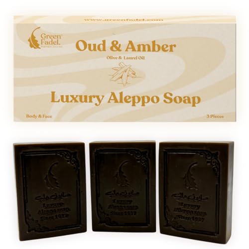 GREEN FADEL (Luxury) Original Aleppo tvål med Oudh & Amber Aroma, 3-pack, Aleppo tvål med olivolja och lagerolja, olivoljatvål, lyxig Aleppo-tvål, naturlig tvål, för ansikte och kropp