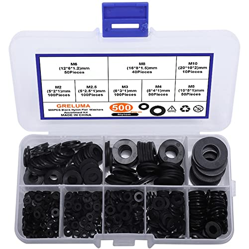 Greluma M2 M2.5 M3 M4 M5 M6 M8 M10(Total 500pcs) Plastic Washer Nylon Flat Washer Screw Bolt Assortment Kit,Black