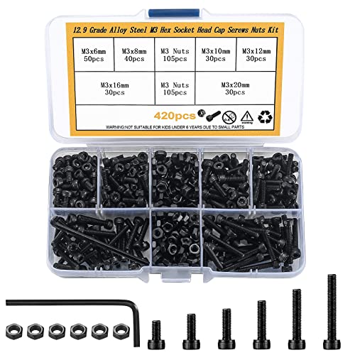 420 st M3 Insexnyckelskruvar och mutter set, Kolstål sexkantskruvar med insexnyckel mutter, Maskinskrusortiment med förvaringslåda