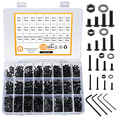 1225 stycken M2 M3 M4 M5 Insexskruvar och Bultar och Mutter och Brickor Sortiment Kit, Kolstål Svart Linsenhuvud Gängade Skruvar och Mutter och Brickor Set
