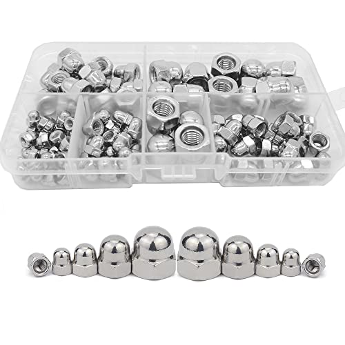 100 stycken rostfritt stål ollon kupol huvud hexmuttrar, huvudlock mutter M8 M6 M5 M4 M3 kupol hex lock muttrar, hexagon ekollon muttrar, mutter sortiment kit (silver)