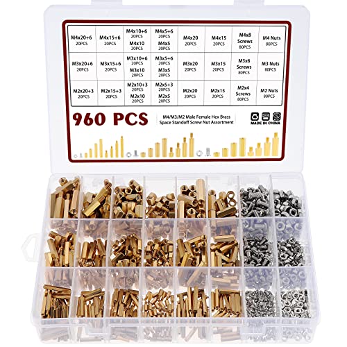 Knpwer 960 stycken Standoff mässing sexkantiga avståndshållare nötter, M2 M3 M4 gängpelare PCB moderkort sortiment kit (960, M2, M3, M4)