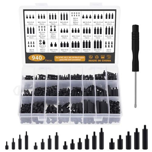 Gueenky 940 stycken standoff skruvar nylon, M2, M2,5, M3, M4, kretskort, avståndshållare, moderkort, standoff avståndsskruvar, svarta hane hona, nylon avståndshållare, skruv mutter