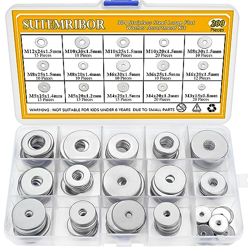Sutemribor 304 Rostfritt stål Stor Fender Bricka Sortimentsats 200 stycken, 15 storlekar - M3 M4 M5 M6 M8 M10 M12