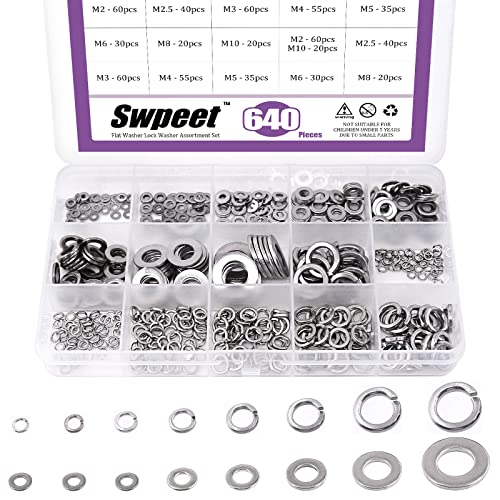 Swpeet 640 st 304 rostfritt stål 8 olika storlekar M2 M2,5 M3 M4 M5 M6 M8 M10 platt bricka och låsbricka sortimentsats, lås metallbrickor stänkskärmar delade låsbrickor för hem, butik